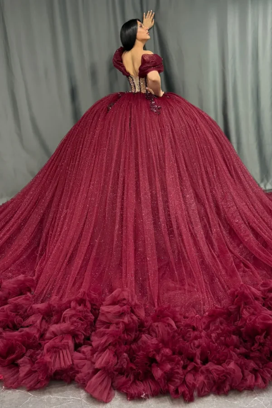 Off Shoulder Sleeveless Burgundy Quinceañera Dress with Beaded Appliques