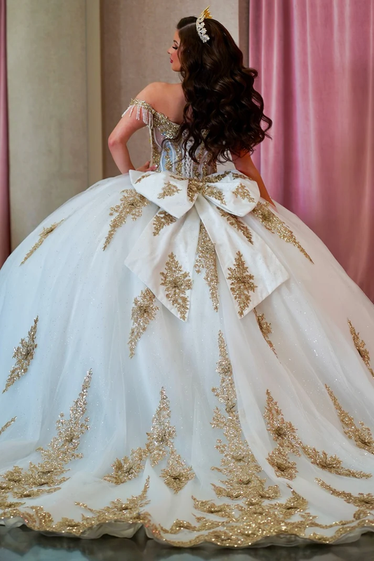 Off Shoulder Sleeveless Gold Sequins Beaded Appliques Bow Knot Sweet 15 Quinceañera Dress