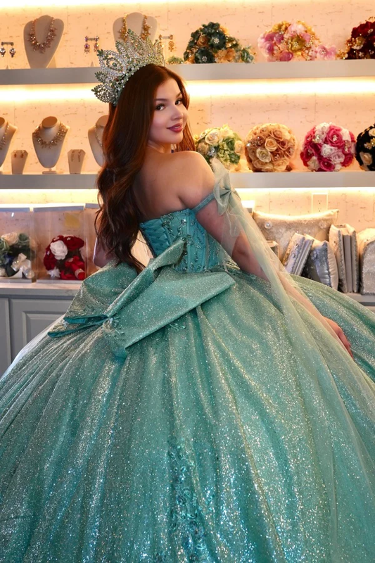 Off Shoulder Sleeveless Green Quinceañera Dress with Sequins Appliques Pleated Bow Knot