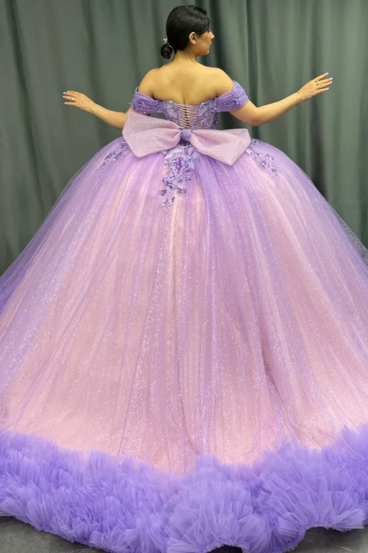 Off Shoulder Sleeveless Lilac Quinceañera Dress with Beaded Sequins Appliques Bow Knot