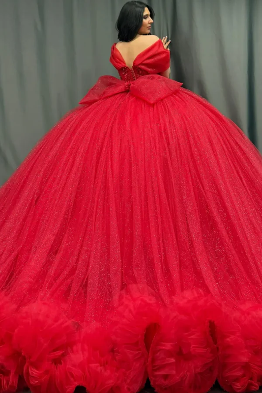 Off Shoulder Sleeveless Red Sweet 15 Quinceañera Dress with Beaded Applqieus Bow Knot