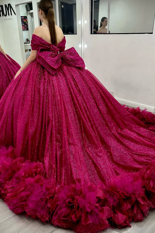 Off Shoulder Sleeveless Ruffles Tiered Bow Knot Fuchsia Sweet 15 Quinceañera Dress