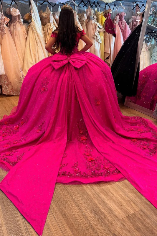 Off Shoulder Sleeveless Hot Pink Sweet 15 Quinceañera Dress with Beaded 3D Flower Appliques Bow Knot