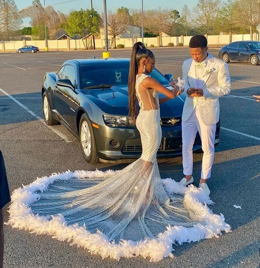 Black Girls Feathers Prom Dresses Beading African Women Mermaid Party Gowns Sequin Evening Dress