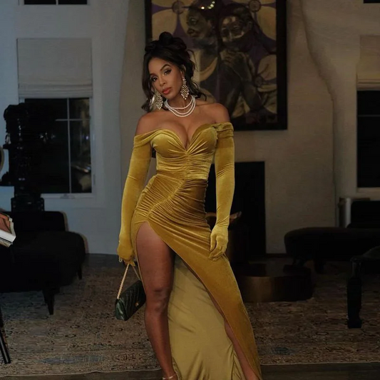Velvet Sexy Elegant Long Prom Dress Off Shoulder With Gloves High Split Women Formal Occasion Evening Party Gowns Custom Made