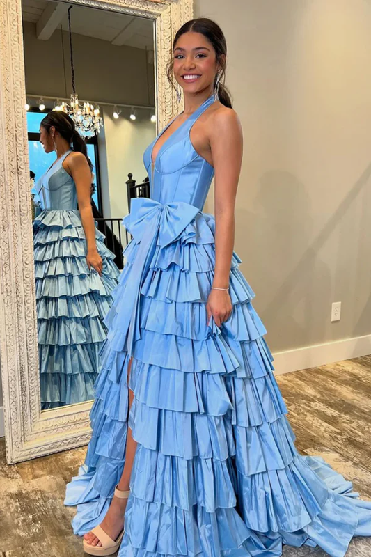 A-Line Low V Neck Halter Bow Knot Tiered Side Slit Prom Dress