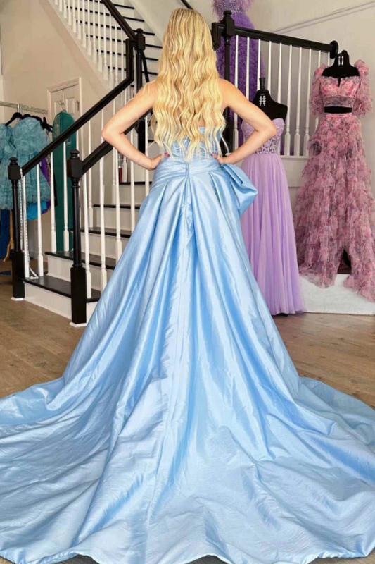 A-Line Strapless Sleeveless Sky Blue Court Train Prom Gown