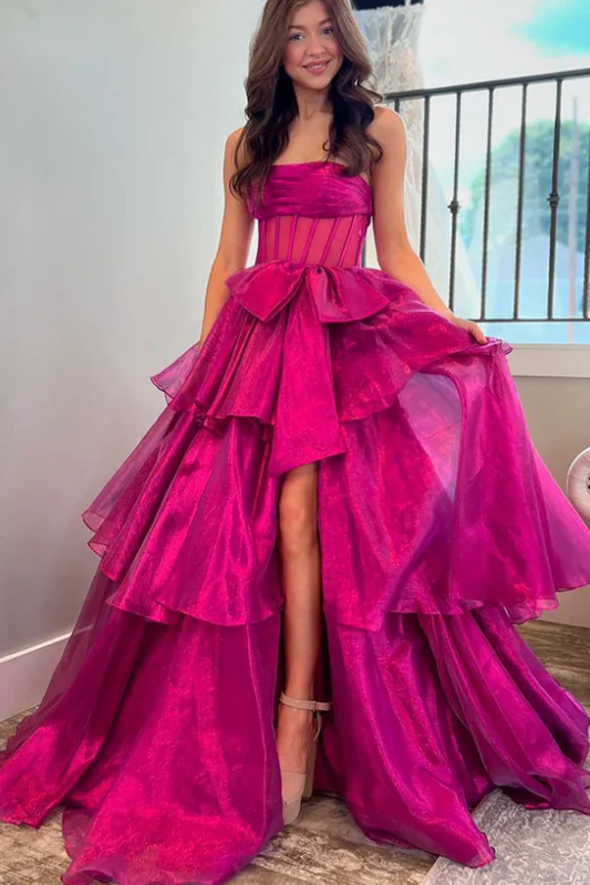 A-Line Strapless Sleeveless Tiered Bow Knot Side Slit Prom Dress