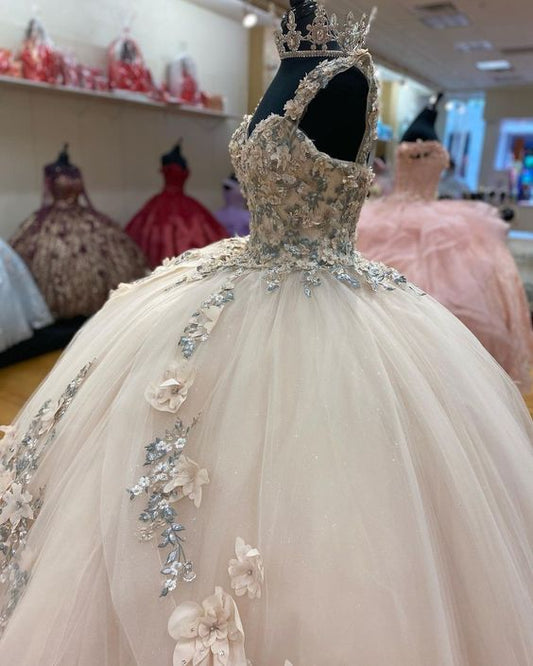 A-line Tulle Ball Gown Puffy Sweet 16 Dress 3D Flowers Birthday Dress