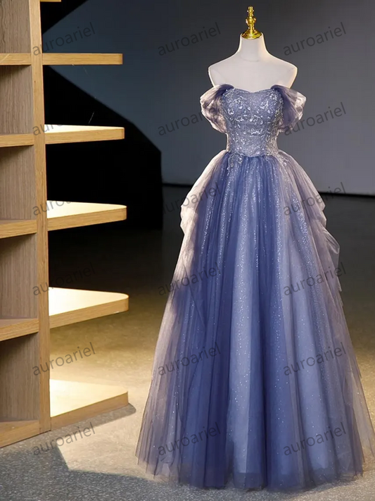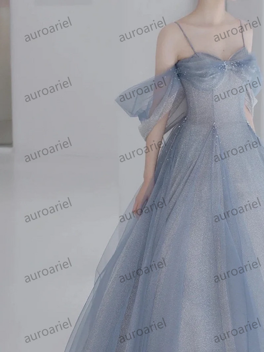 Blue Sequins Tulle Ball Gown,Off Shoulder Blue Prom Dress,Formal Prom Dress,A line Fairy Prom Dress, Evening Ball Gown,Maxi Blue Prom Dress