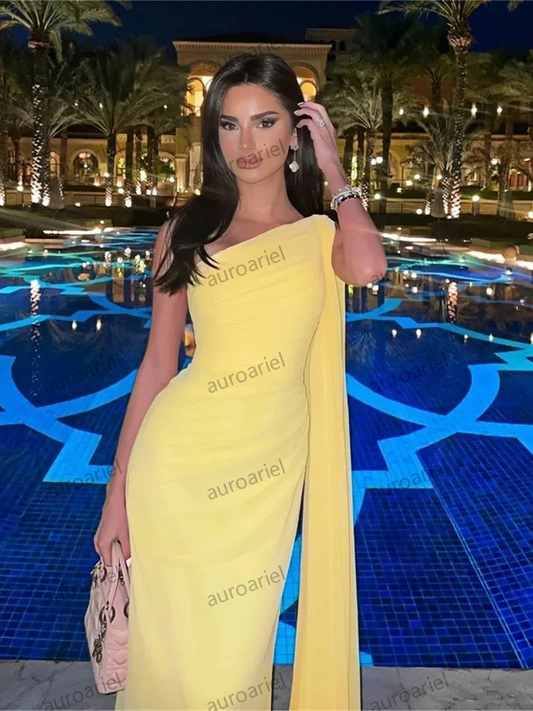 Yellow Celebrity Evening Dress One-Shouldered Chiffon Sleeveless Mopping Slim Fit Formal Occasion Cocktail Prom Gown