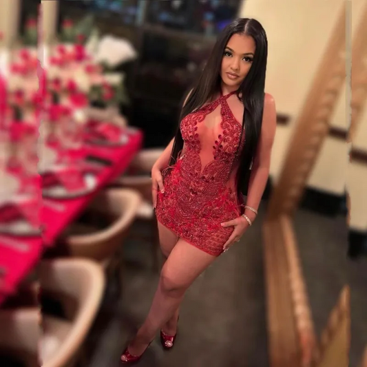 Luxury Rhinestone Short Prom Dresses Halter Beading Birthday Party Gowns Women See Through Evening DressRegular price $245.75 USDRegular priceUnit price / per$0.00 USDSale price $245.75 USD