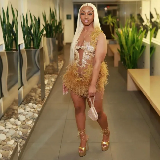 Sexy See Through Birthday Outfit Luxury Rhinestone Short Party Gowns Feathers Black Girls Mini Prom Dress Robes De SoiréeRegular price $255.75 USDRegular priceUnit price / per$0.00 USDSale price $255.75 USD