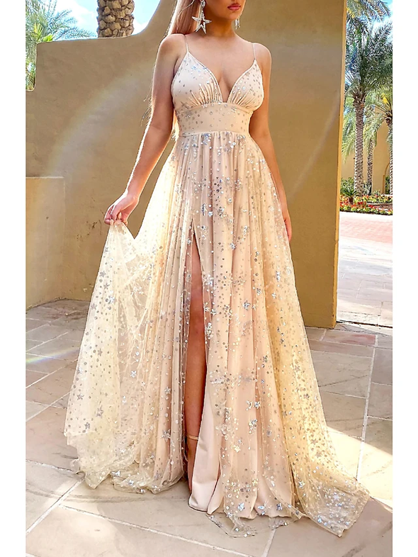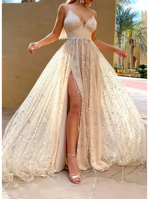 A-Line Glittering Sexy Engagement Prom Dress V Neck Sleeveless Sweep / Brush Train Satin with Pleats Sequin Split