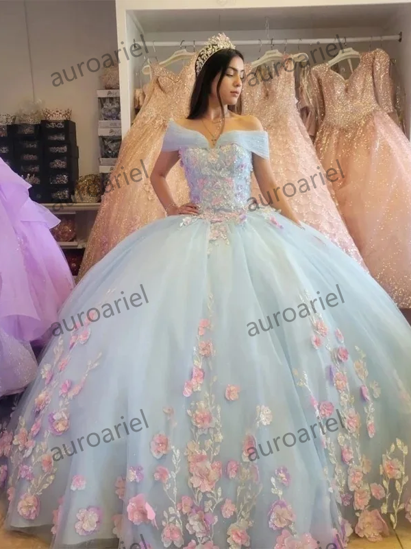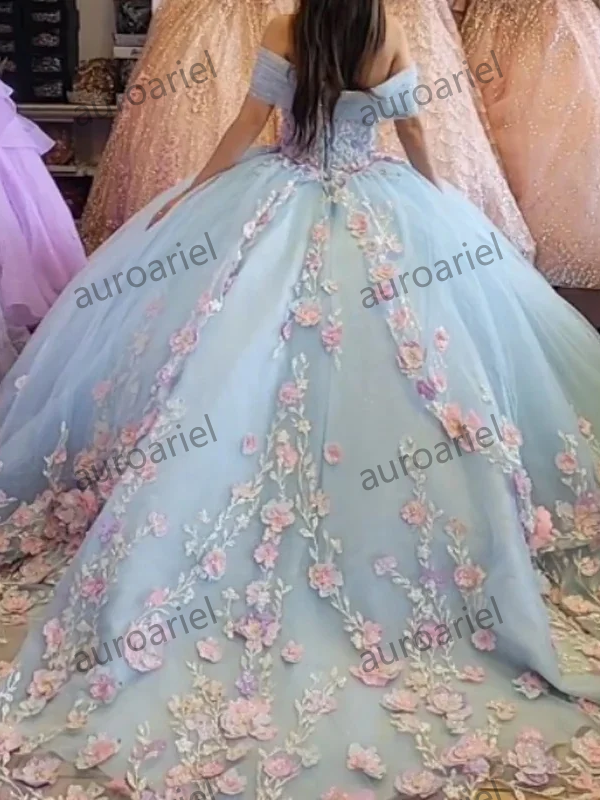 Blue Quinceanera Dresses With 3D Pink Lace Appliques Beading Ball Gown