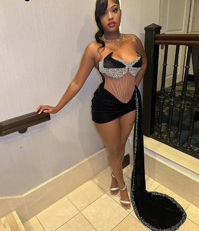 Sexy Black Prom Dress Velvet Luxury Crystal Beads Birthday Party Cocktail Gown Illusion Homecoming Robe De Bal Lace Up Back