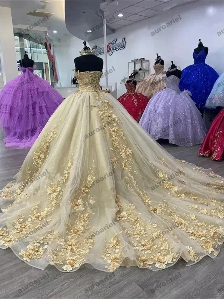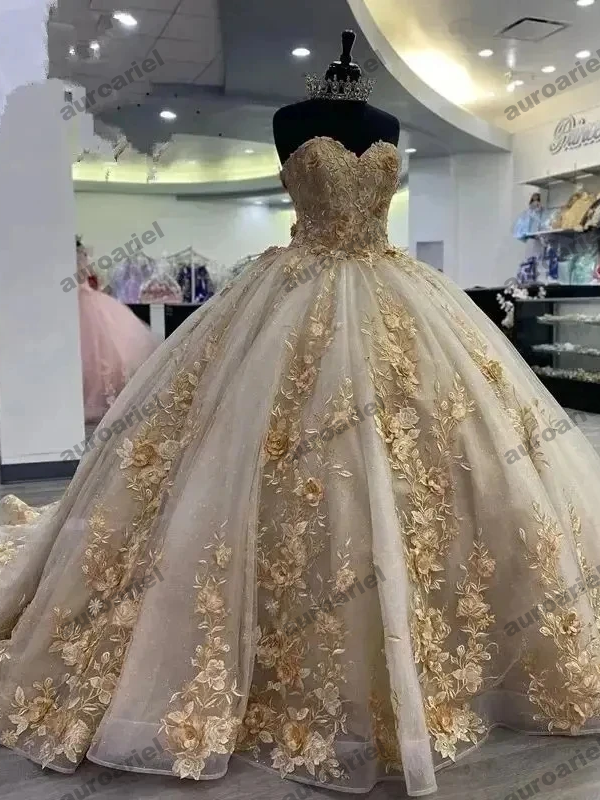 Champagne Quinceanera Dress Gold 3D Flower Lace Vestidos De 15 Anos Formal Birthday Party Customized