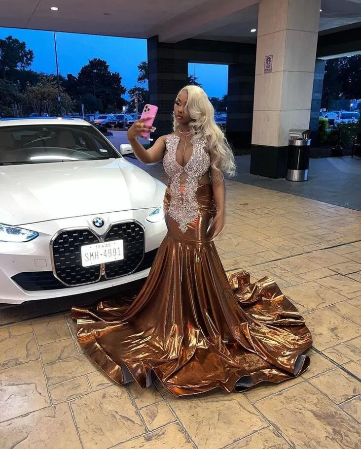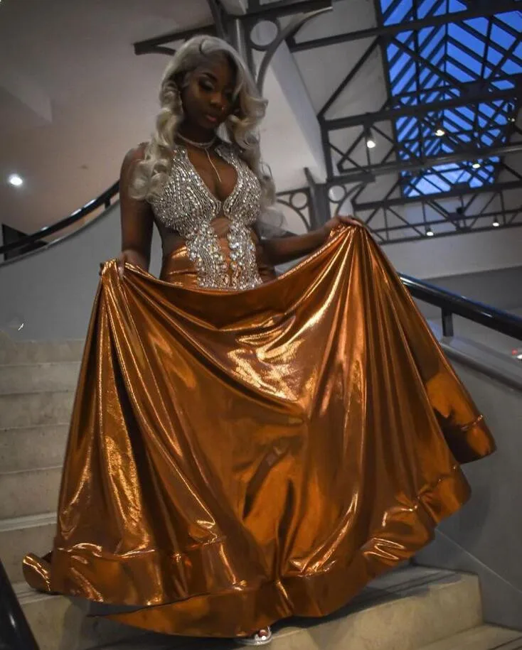 Dark Gold Sparkly Afircan Prom Dresses for Women Sparkly Diamond Crystal Mermaid Birthday Party Evening Gown for Black Girl