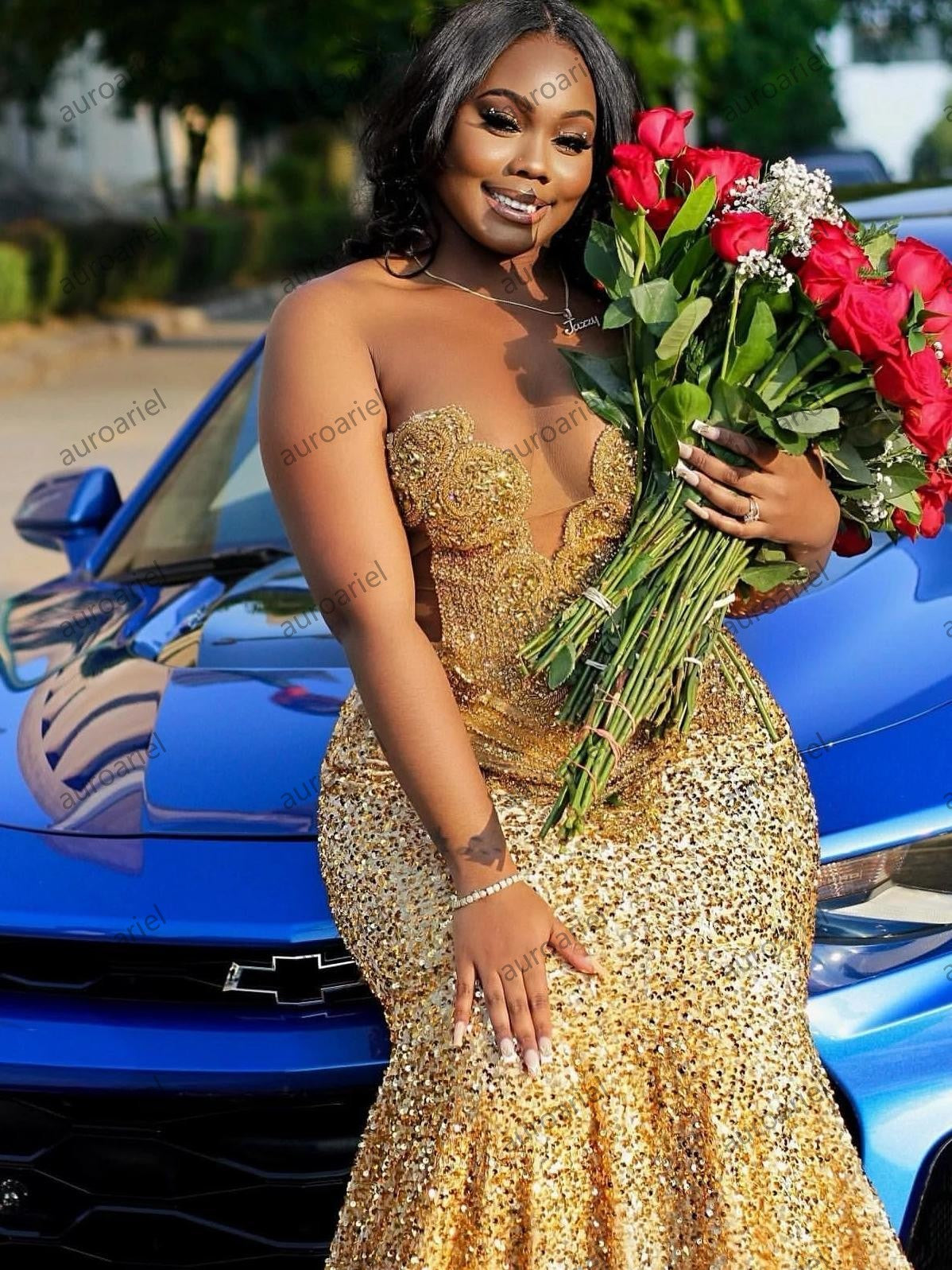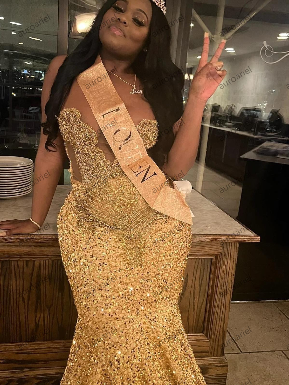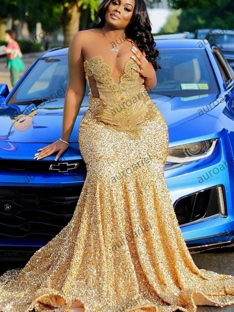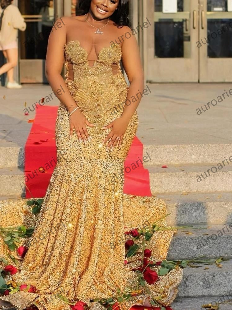 Gold Sequins Mermaid Prom Dress For Black Girls Crystal Rhinestone Beaded Party Gala Gown