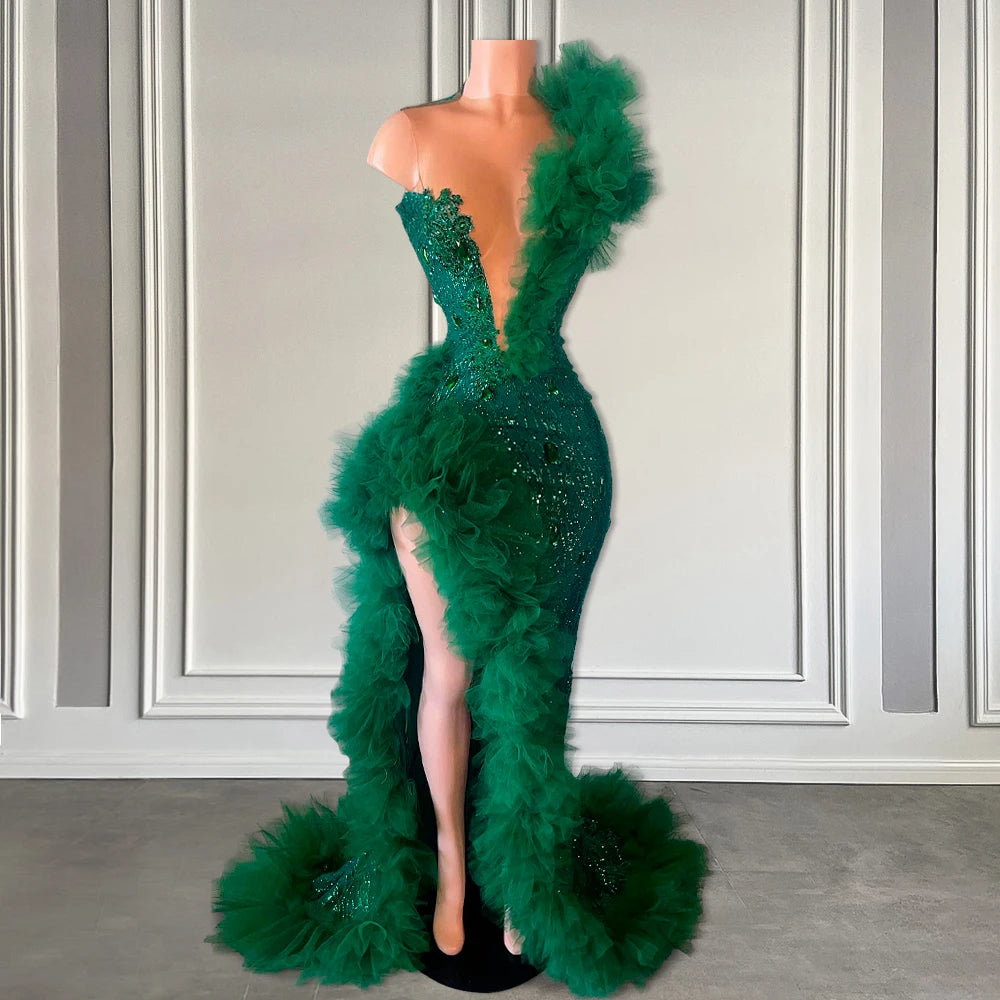 Green Long Prom Dresses For Black Girls Sexy Side Split Ruffle Mermaid Glitter Sequin Prom Formal Party Gowns Customized