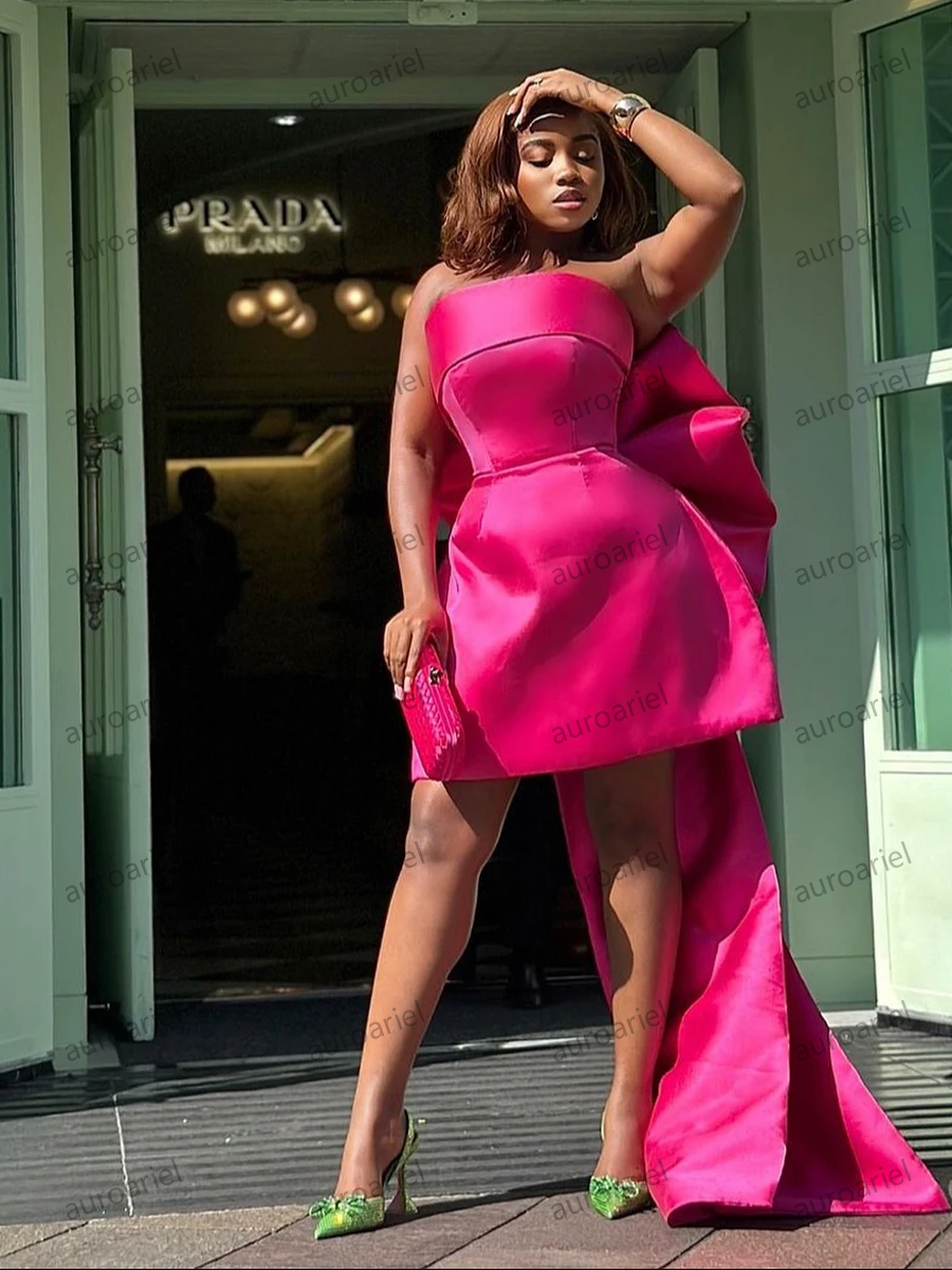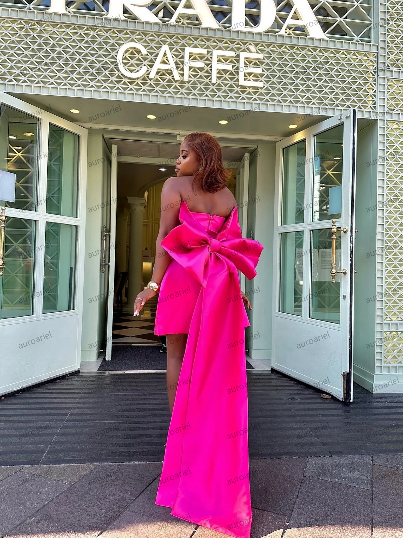 Hot Pink Short Prom Party Dresses with Detachable Bow Fuchsia Satin Mini Length Formal Evening Gown Big Bow Event Birthday Dress