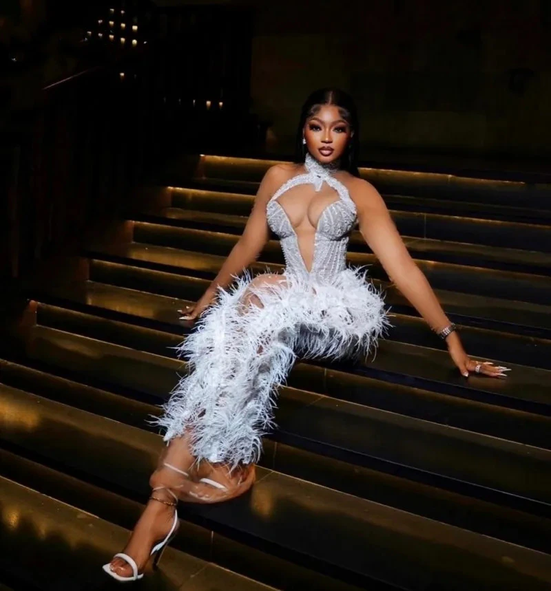Luxurious High Neck Sheath Prom Dresses Sexy Sheer Long Sleeve Beading Feathers Evening Gowns Vestidos De Graduación