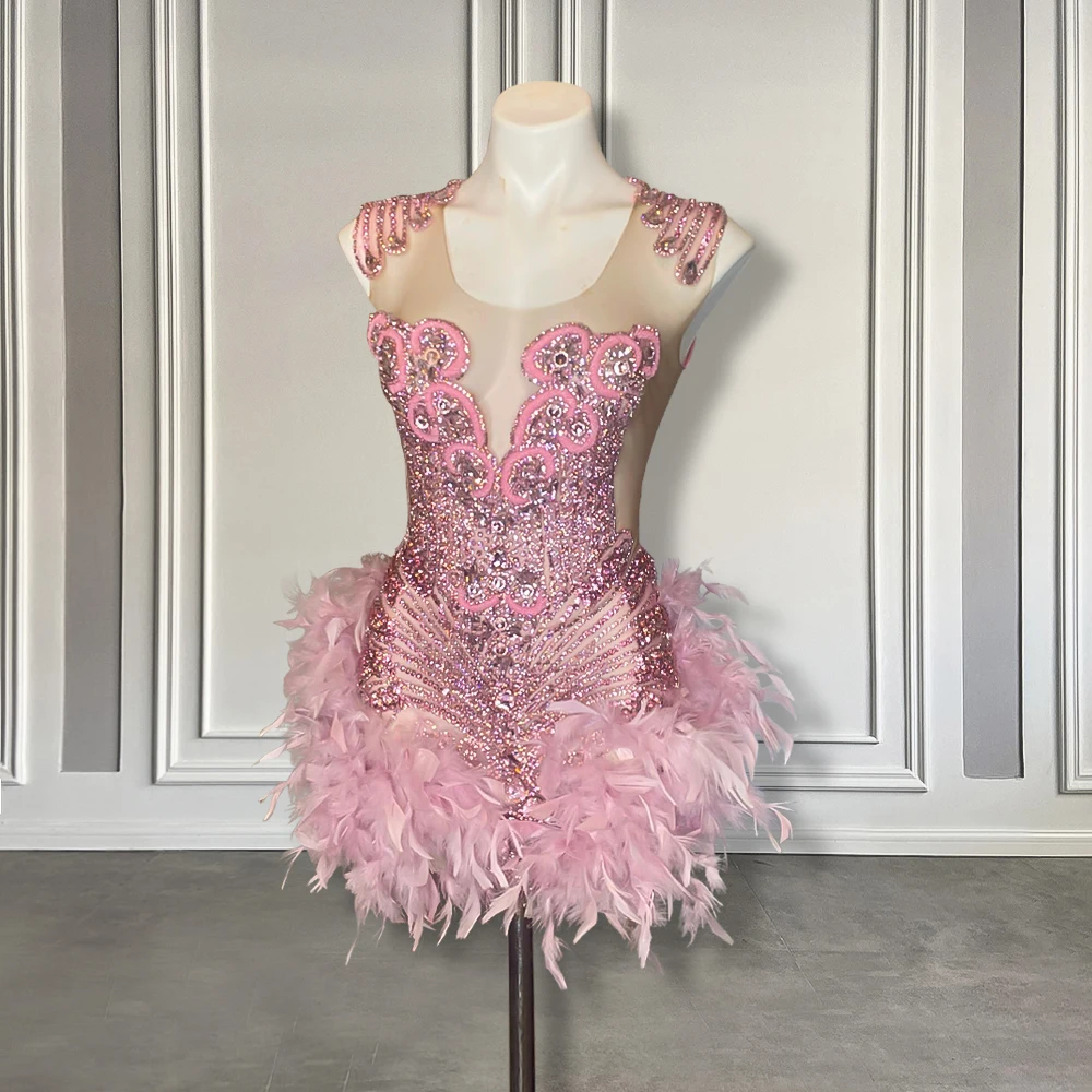 Luxury Pink Short Prom Dress Black Girls Beaded Crystal Feather Birthday Party Dress Scoop Neck Mini Cocktail Homecoming Gowns