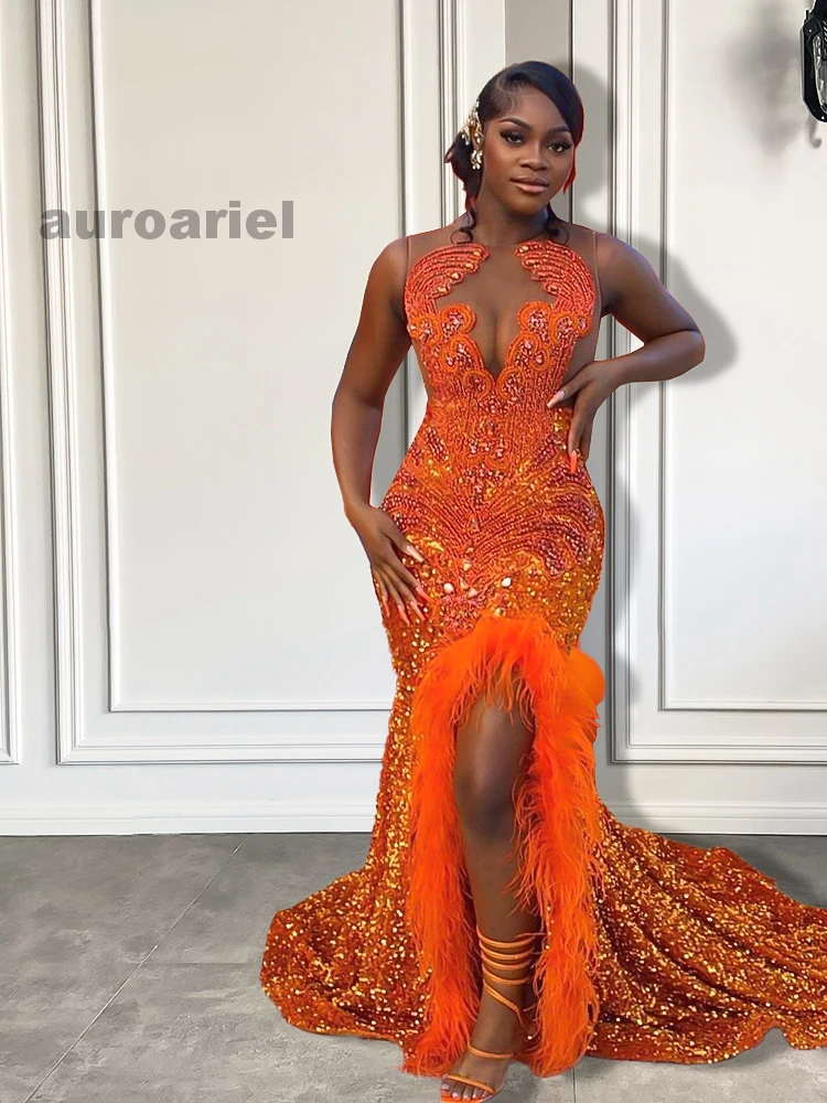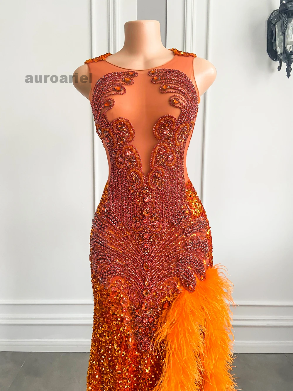 Orange Prom Dresses Sexy Side Slit Sequin Diamond Feather