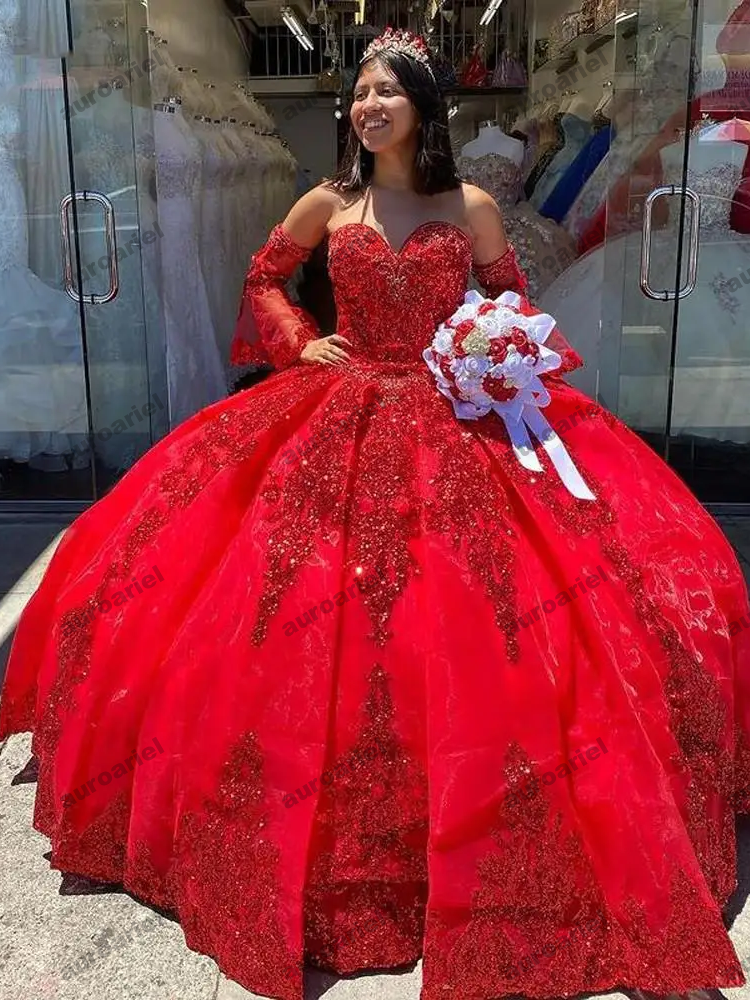 Red Ball Gown Quinceanera Prom Dresses V Neck Long Sleeves Gold Applique Lace Sweep Train Sweet 15 Dress