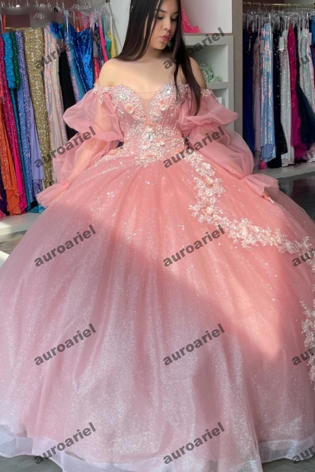 Shiny Pink Long Sleeve Quinceanera Dress Ball Gown Applique Beaded Sequins Corset Sweet 16 Vestido De 15 Anos
