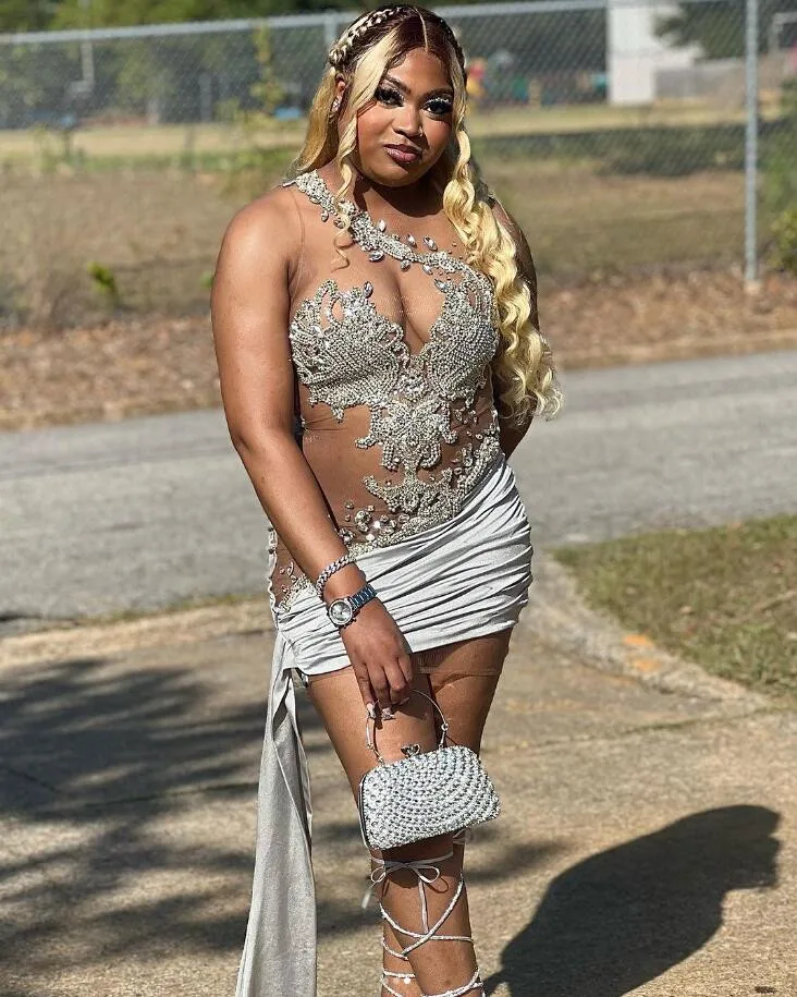 Silver Diamond Crystal Mini Cocktail Evening Dress for Women Plus Size Black Girl Sheer Mesh Birthday Homecoming Gown Gala