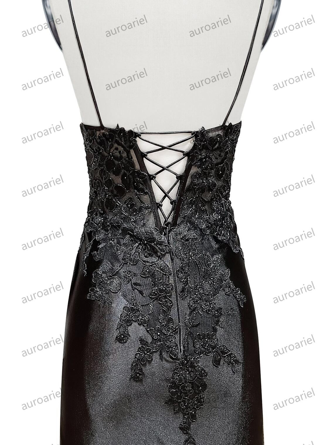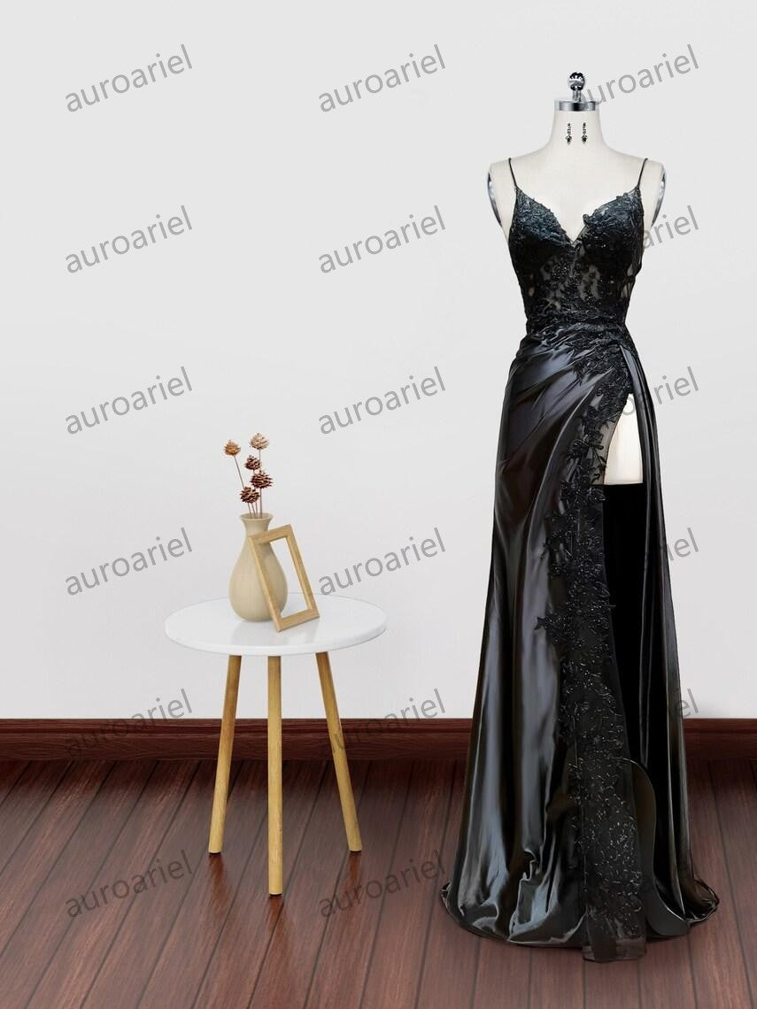 V Neck Black Mermaid Lace Prom Dresses, Black Mermaid Lace Formal Evening Dresses
