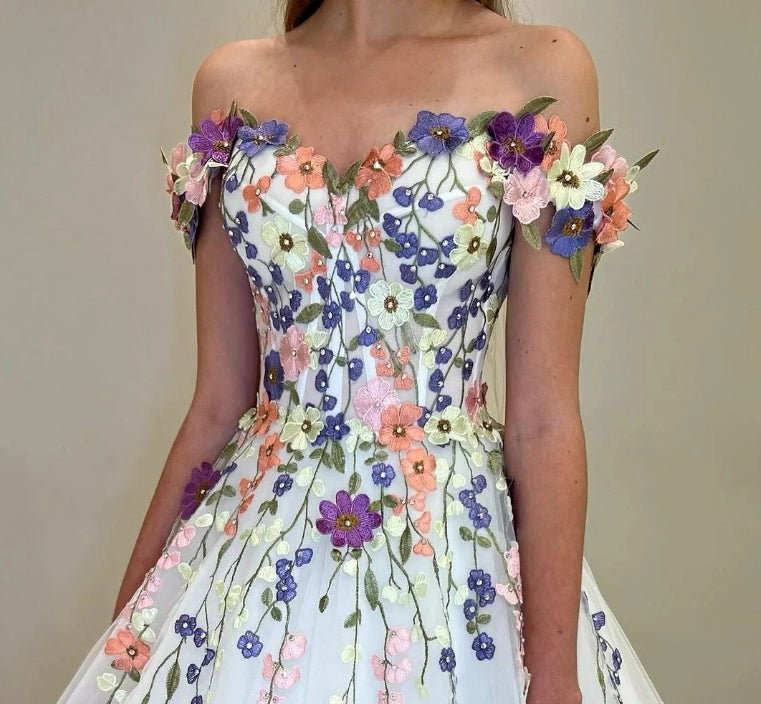 Off The Shoulder Wedding Dress Vestido De Novia Flower Lace Evening Dress White Corset Back Prom Dress With Appliques
