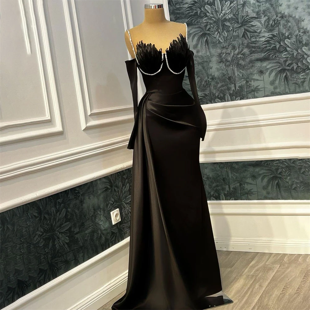 Black Spaghetti Strap Evening Dresses for Women Sweetheart Full Sleeve Prom Dresses Floor Length Feathers Mermaid فستان سهرة