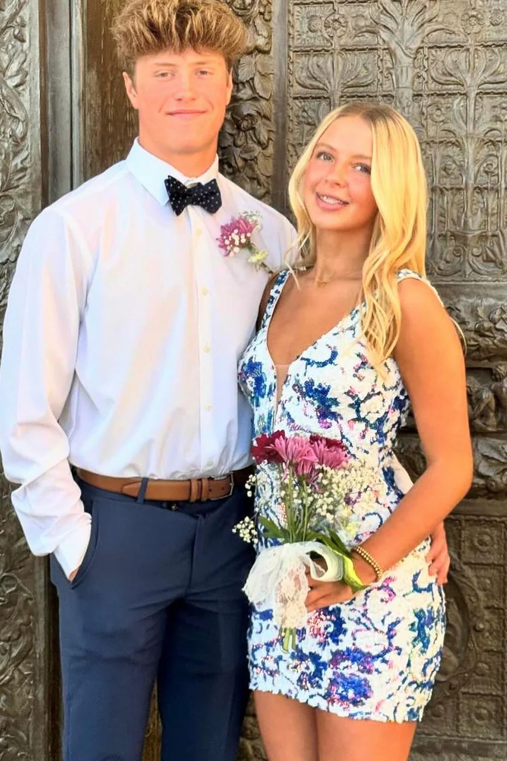Cute V Neck Purple Sequins Tight Homecoming Dresses