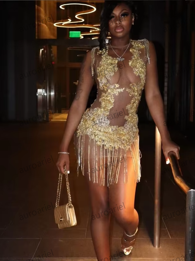 Gold Luxurious Short Cocktail Dresses Glitter Diamante Fringe Black Girls Birthday See Through Mesh
