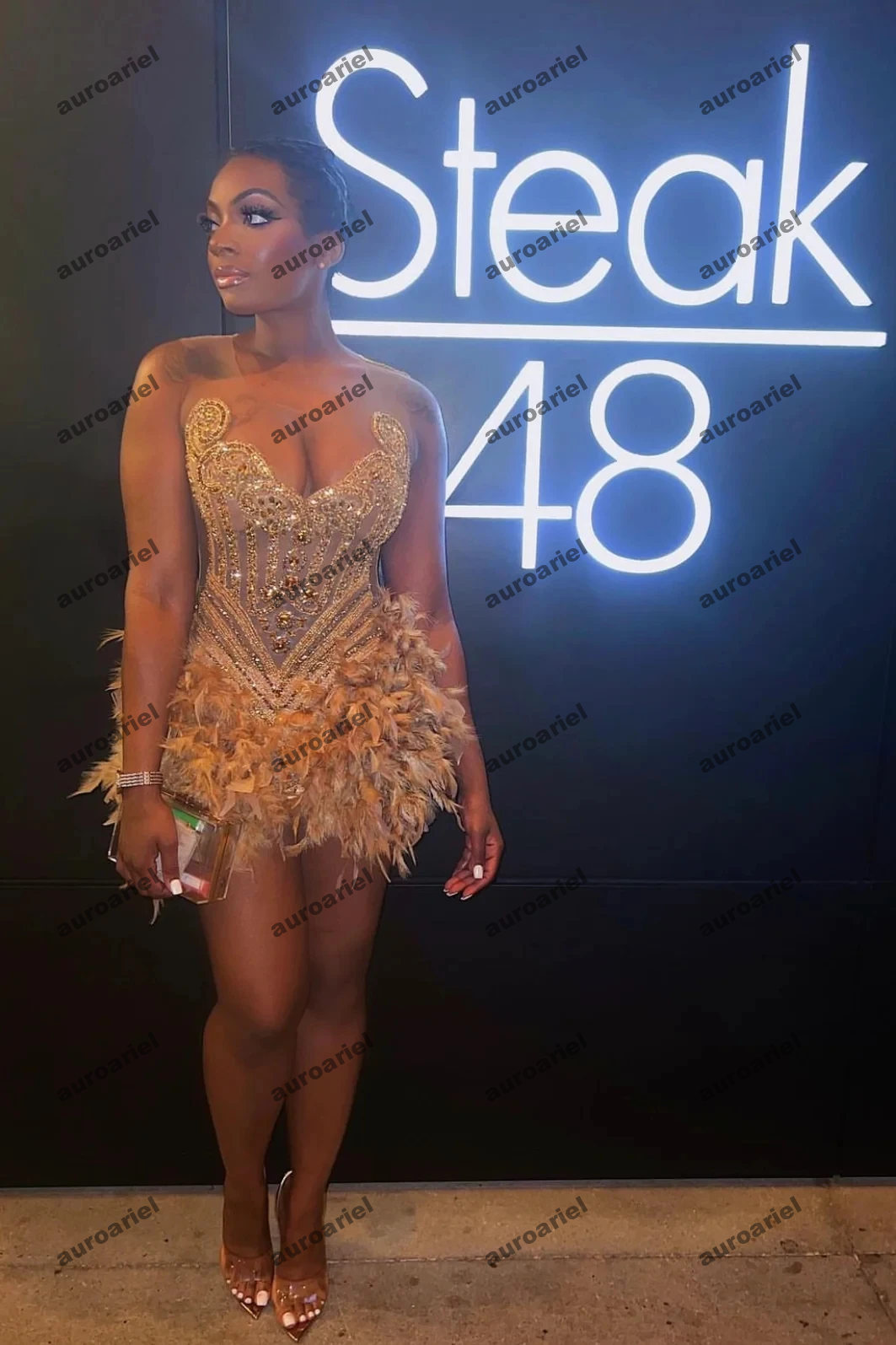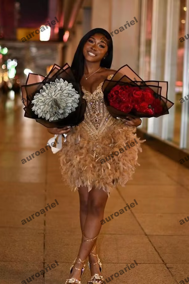 Gold Luxury Short Prom Homecoming Dresses for Black Girl Sparkly Diamond Crystal Feather Birthday Gown vestidos de graduación