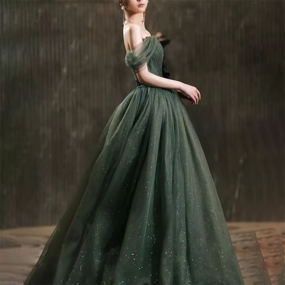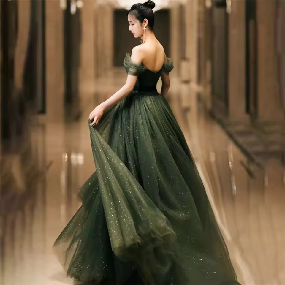 Lily Dark Green Shiny Formal Dresses V Neck Off The Shoulder Party Dress For Wedding A Line Special Occasion Dresses robe soirée