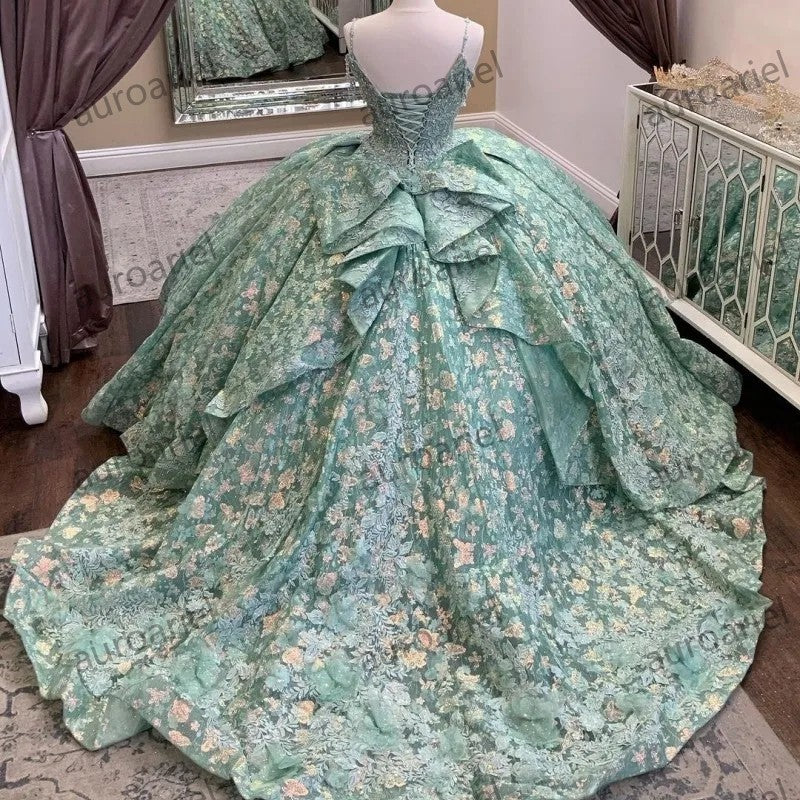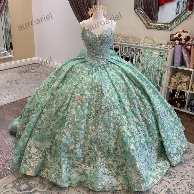 Mint Green Quinceanera Dresses Ball Gown Appliques Lace Beading Sleeveless Spaghetti Strap
