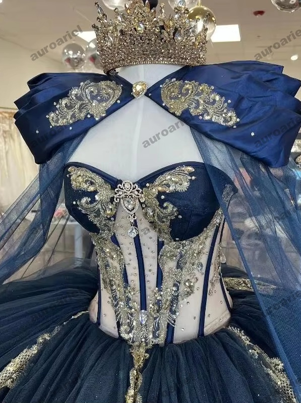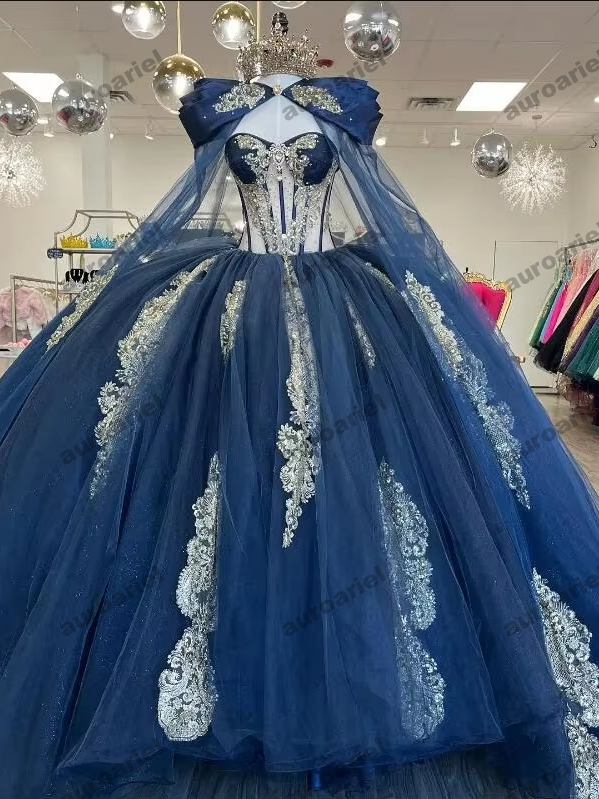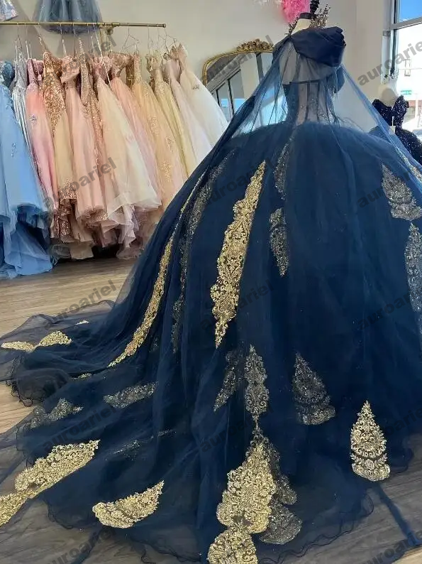 Navy Blue Quinceanera Dresses Gold Applique With Cape Ball Gown Princess Birthday Party Sweet 16