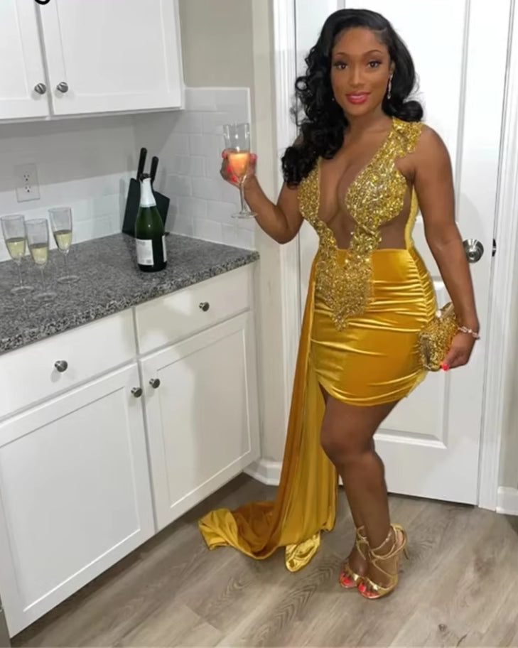 New Golden Diamonds Prom Dresses Velvet Side Train Glitter Beading Crystal Rhinestones Birthday Party Senior Homecoming