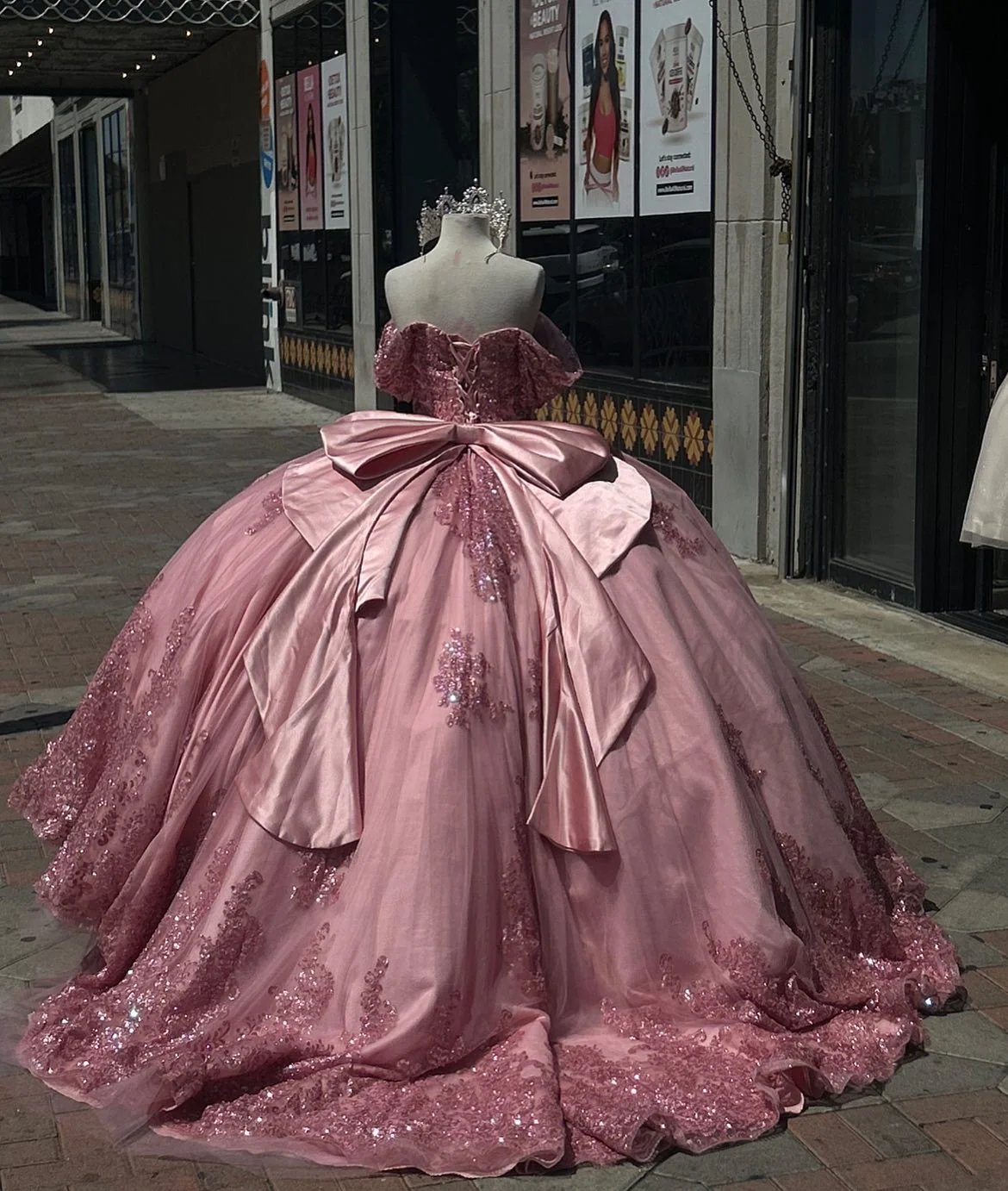 This elegant pink quinceañera dress features an off-shoulder, sleeveless design adorned with intricately beaded appliques and delicate ruffles. A stylish bow knot adds a charming touch, enhancing its youthful and sophisticated appeal. Perfectly crafted to celebrate a Sweet 15, this gown combines classic elegance with modern detailing for a memorable and graceful look.
