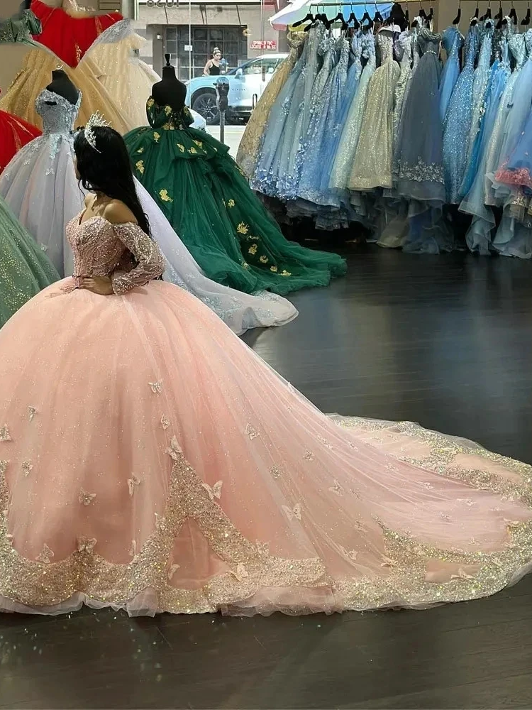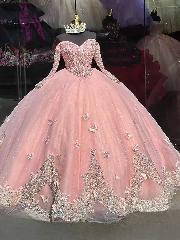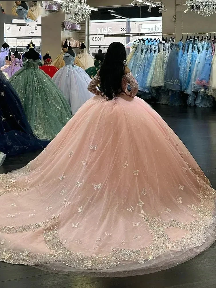 Pink Quinceanera Dresses Off-Shoulder Long Sleeves Butterfly Appliques Princess Birthday Party