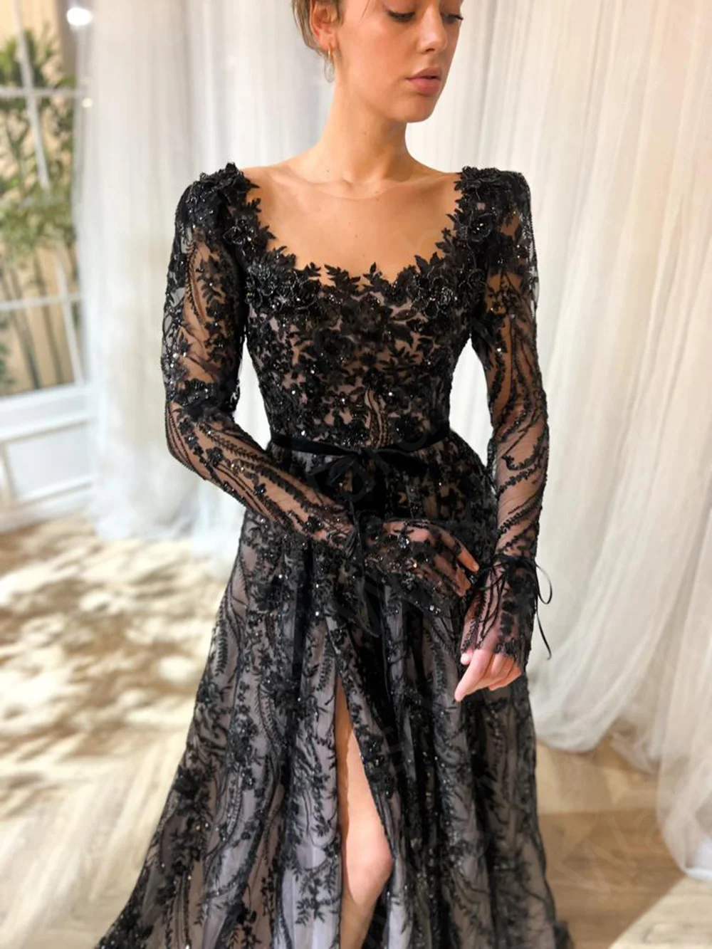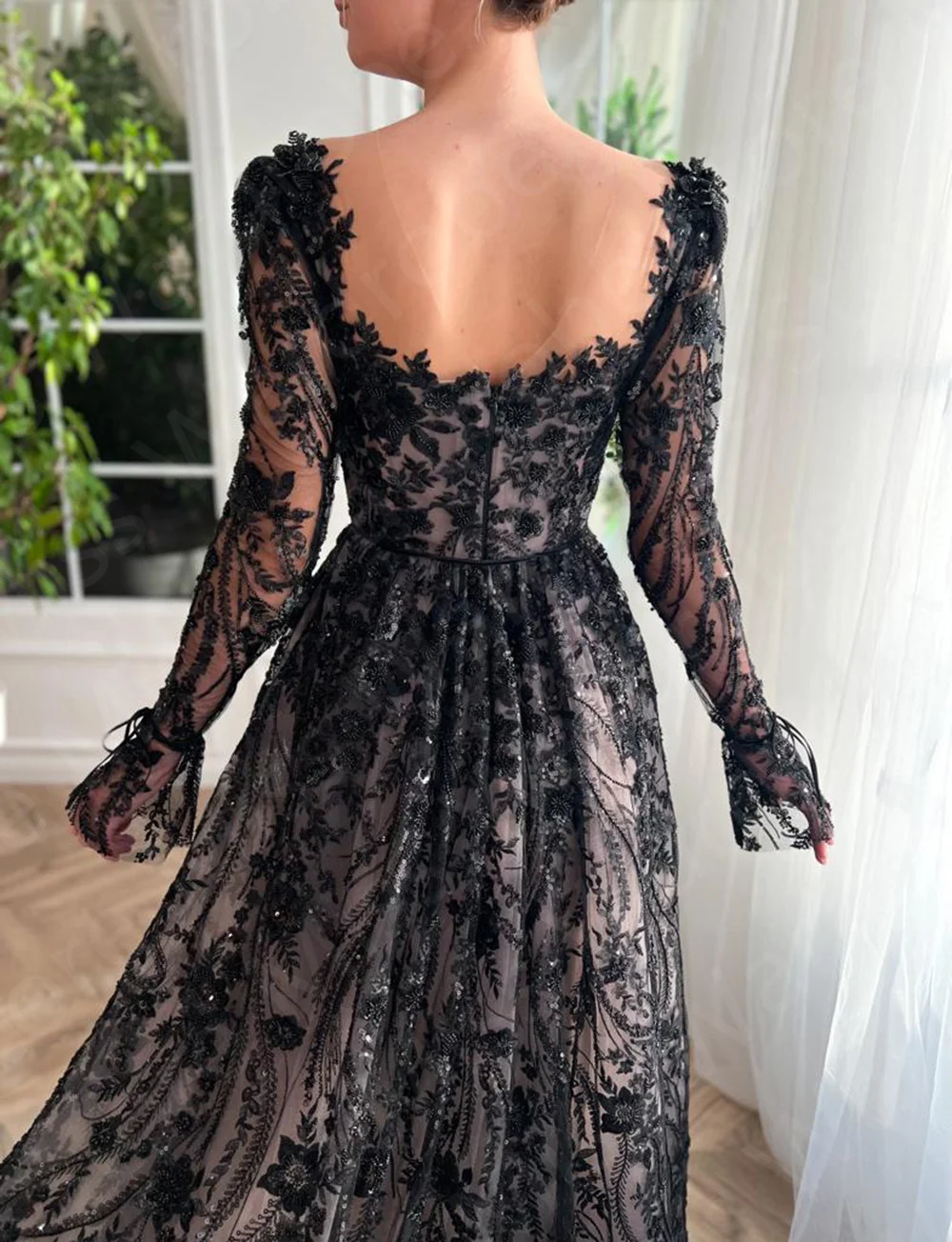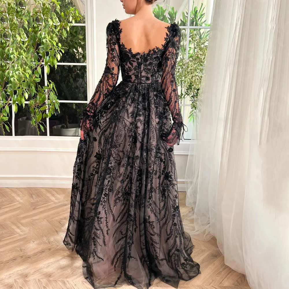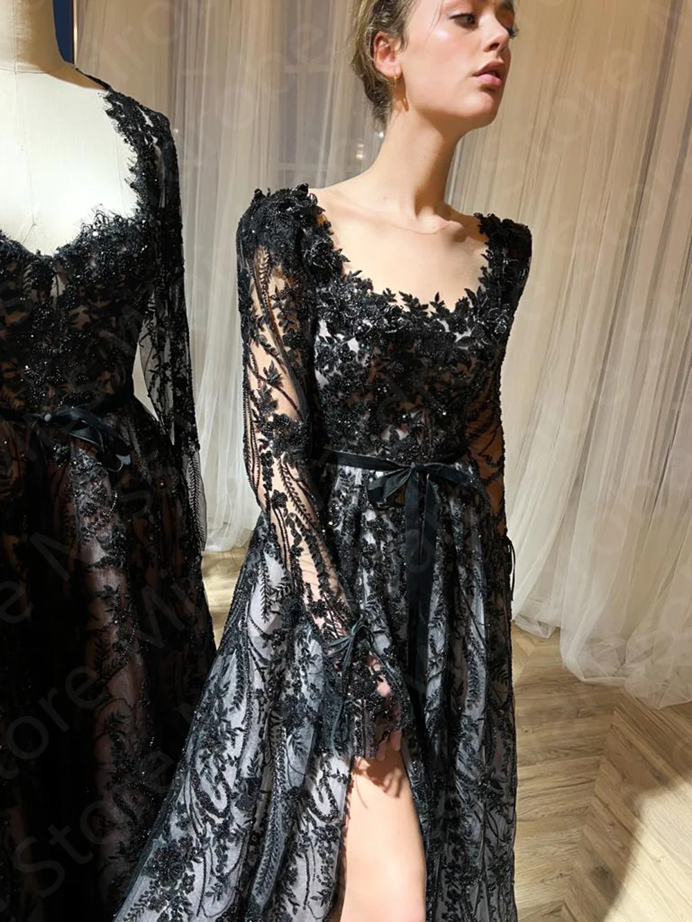 Sevintage Black Embroidery Lace Beadings Crystal Prom Dresses Side Split A-Line Long Sleeves Wedding Party Gowns Evening Dress