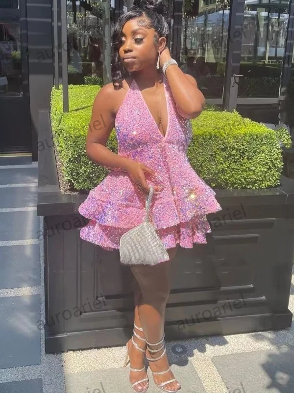Sexy Pink Short Prom Dresses Halter Sequin A Line Backless Mini Party Gowns Cocktail Dress
