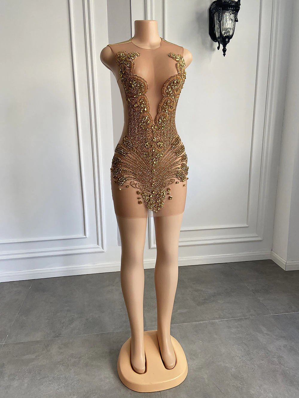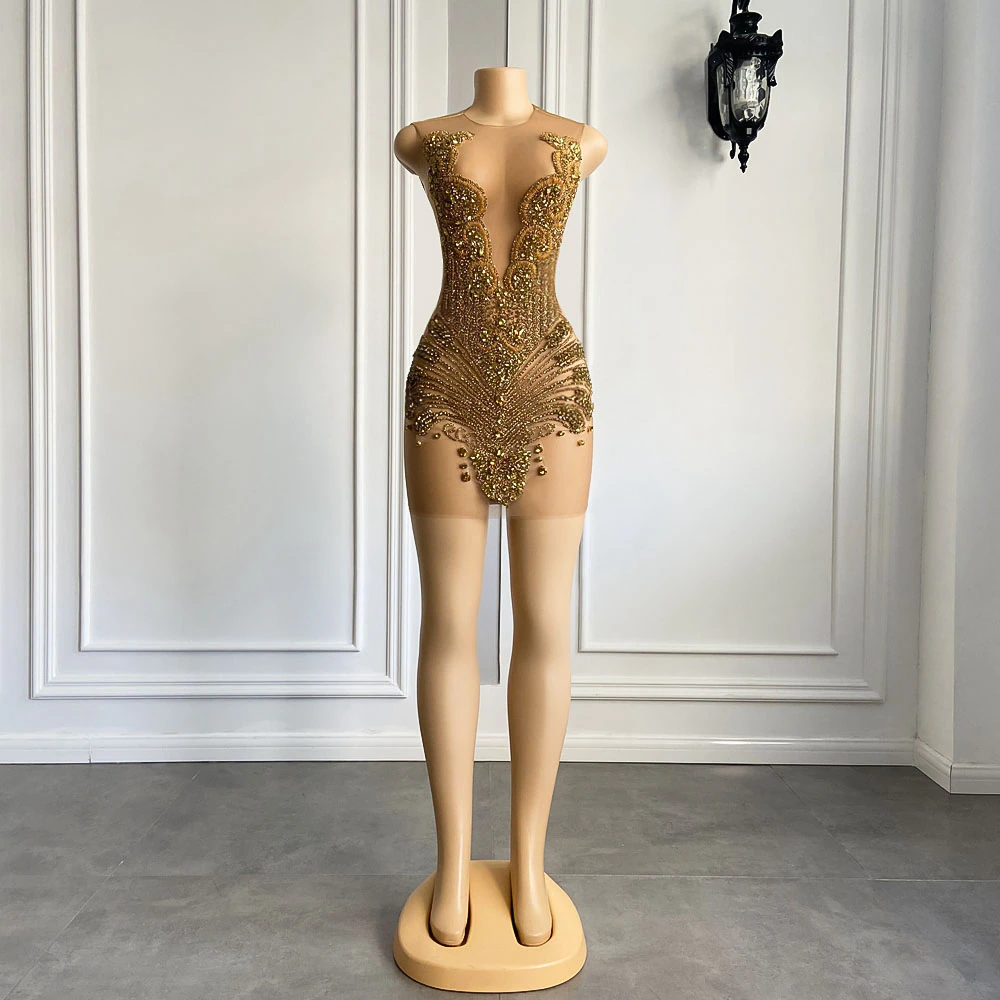 Sexy Sheer See Through Black Girl Short Prom Dress Golden Diamond Luxury Beaded Crystals Women Cocktail Party Gowns For Birthday