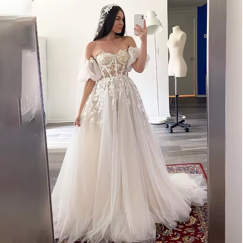 Short Puff Sleeves 3D lace Wedding Dresses Champagne Liner Tulle Appliques Formal Bridal Gowns Womens New