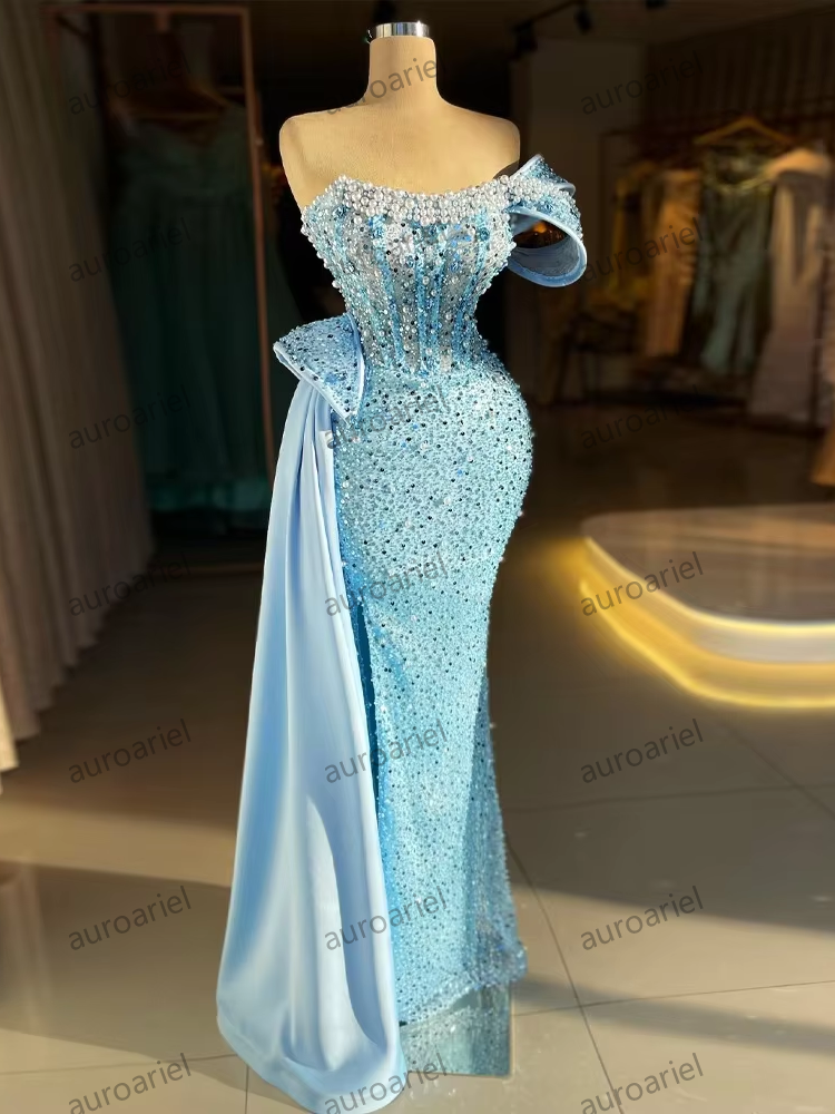 Sparkly Beaded Mermaid Prom Evening Dresses with Slit Sequin Strapless Formal Party Gown Cocktail Dress