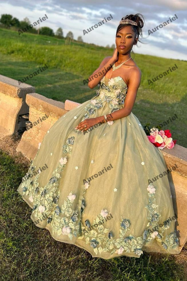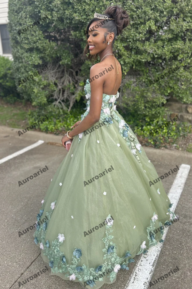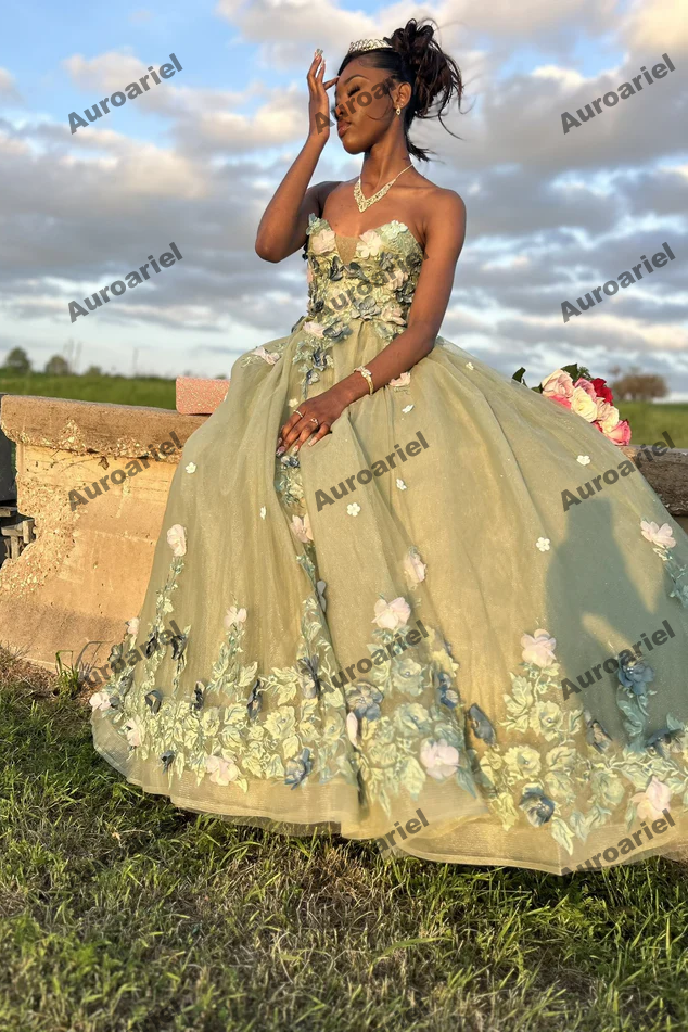 Strapless Green Quinceanera Dresses 3D Flower Applique Sweet 16 Dress Ball Gown
